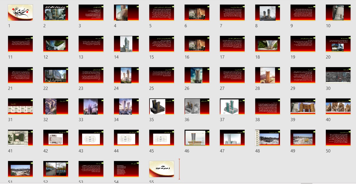 در این بخش، تحلیل نمونهای موفق از برجهای ایرانی با عنوان «برجهای دوقلوی آیسان تبریز» ارائه میشود. مطالب به صورت یک فایل پاورپوینت ۵۷ اسلایدی تنظیم شدهاند که در ادامه، جزئیات کامل آن را بررسی خواهیم کرد. در پایان بخش نیز، لینکهایی با موضوعات مشابه قرار داده شده است.